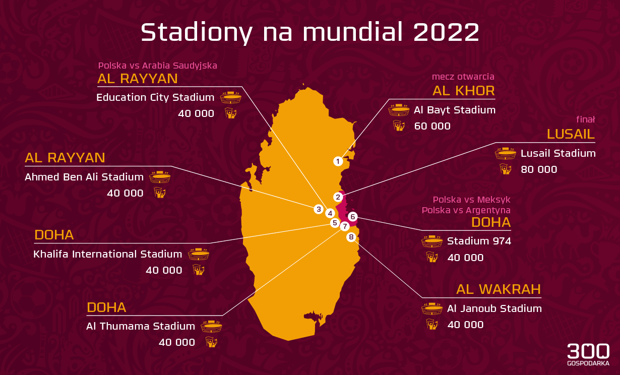 Największym stadionem jest Lusail Stadium, który na mundialu pomieści 80 tysięcy osób. Na jego budowę przeznaczono 767 milionów dolarów.