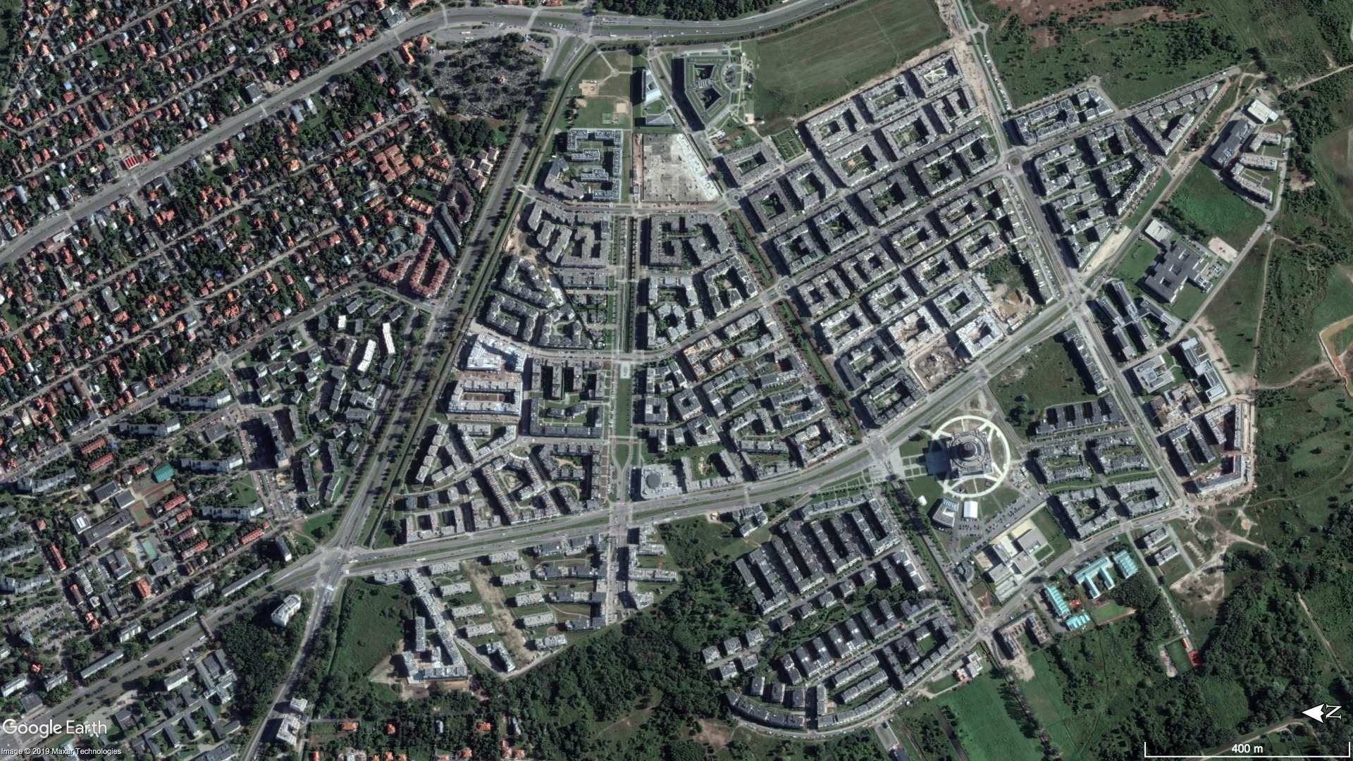 Poniższe zdjęcia satelitarne pokazują okolice Spodka w Katowicach w 2009 i w 2019 roku.