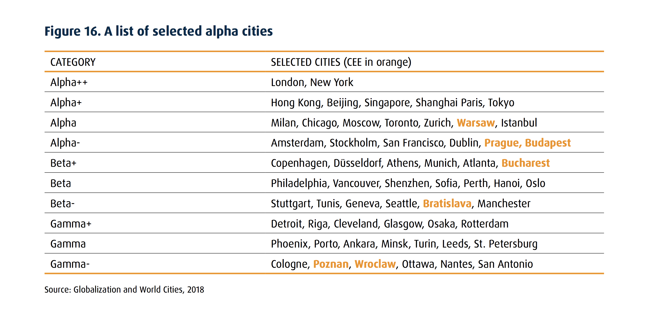 Warszawa jest najważniejszym miastem Europy Środkowej z globalnej perspektywy, a zarazem najwyżej ocenionym miastem Alpha, o czym świadczy stosunkowo duża liczba połączeń lotniczych – prawie tyle samo, co Berlin, stolica największej europejskiej gospodarki.