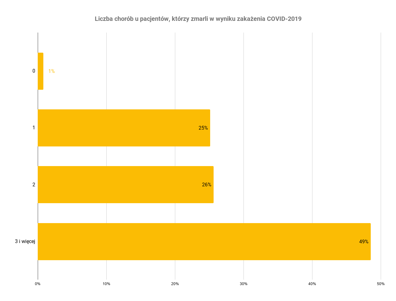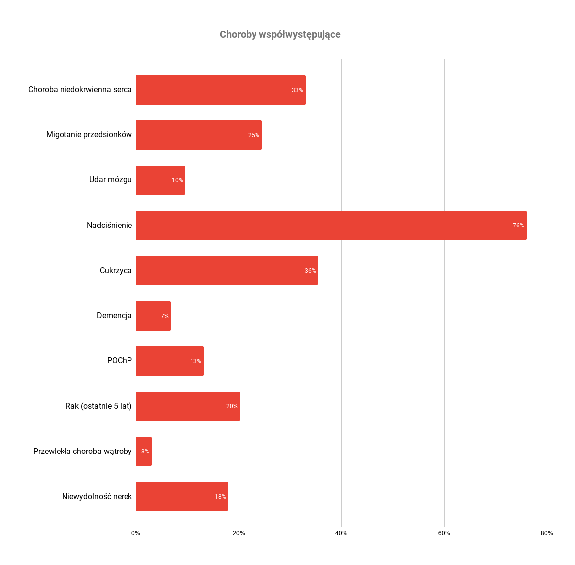 5. U ponad dwóch trzecich osób, które zmarły, stwierdzono co najmniej jedną współwystępującą chorobę, wśród nich: choroby kardiologiczne, układu oddechowego, cukrzycę, choroby układu odpornościowego i nerek, onkologiczne, metaboliczne, otyłość (próba: 355 osób).