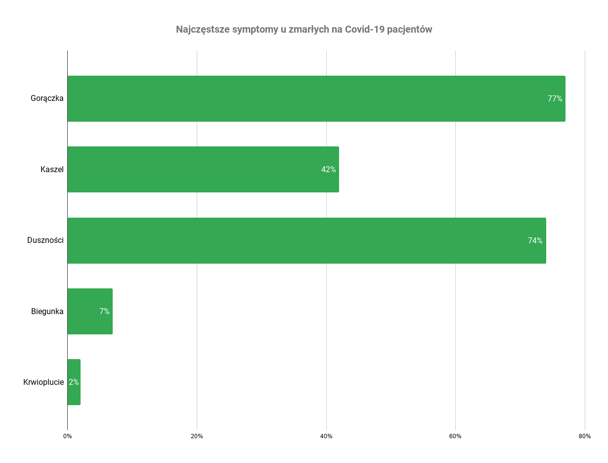 4. Najczęściej obserwowane objawy przed hospitalizacją u zmarłych pacjentów z Covid-19 to duszność i gorączka.